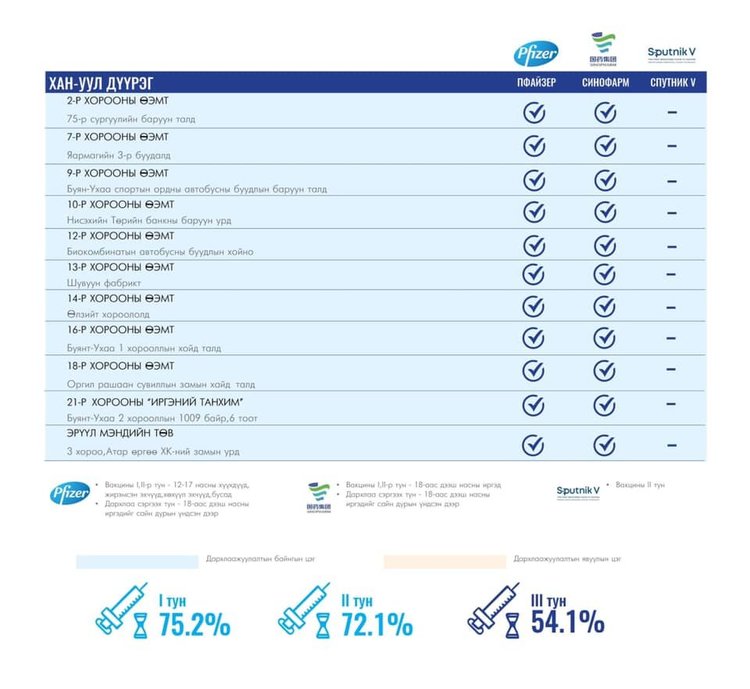 Өнөөдөр Улаанбаатар хотод суурин 39 цэгт 39 багийн 141 эмч, ажилтан ажиллана. Та өөрт ойр вакцины аль ч цэгт очиж дархлаажуулалтад хамрагдах боломжтой. Дархлаажуулалтын цэгүүд 09:00-16:00 цаг хүртэл ажиллана.