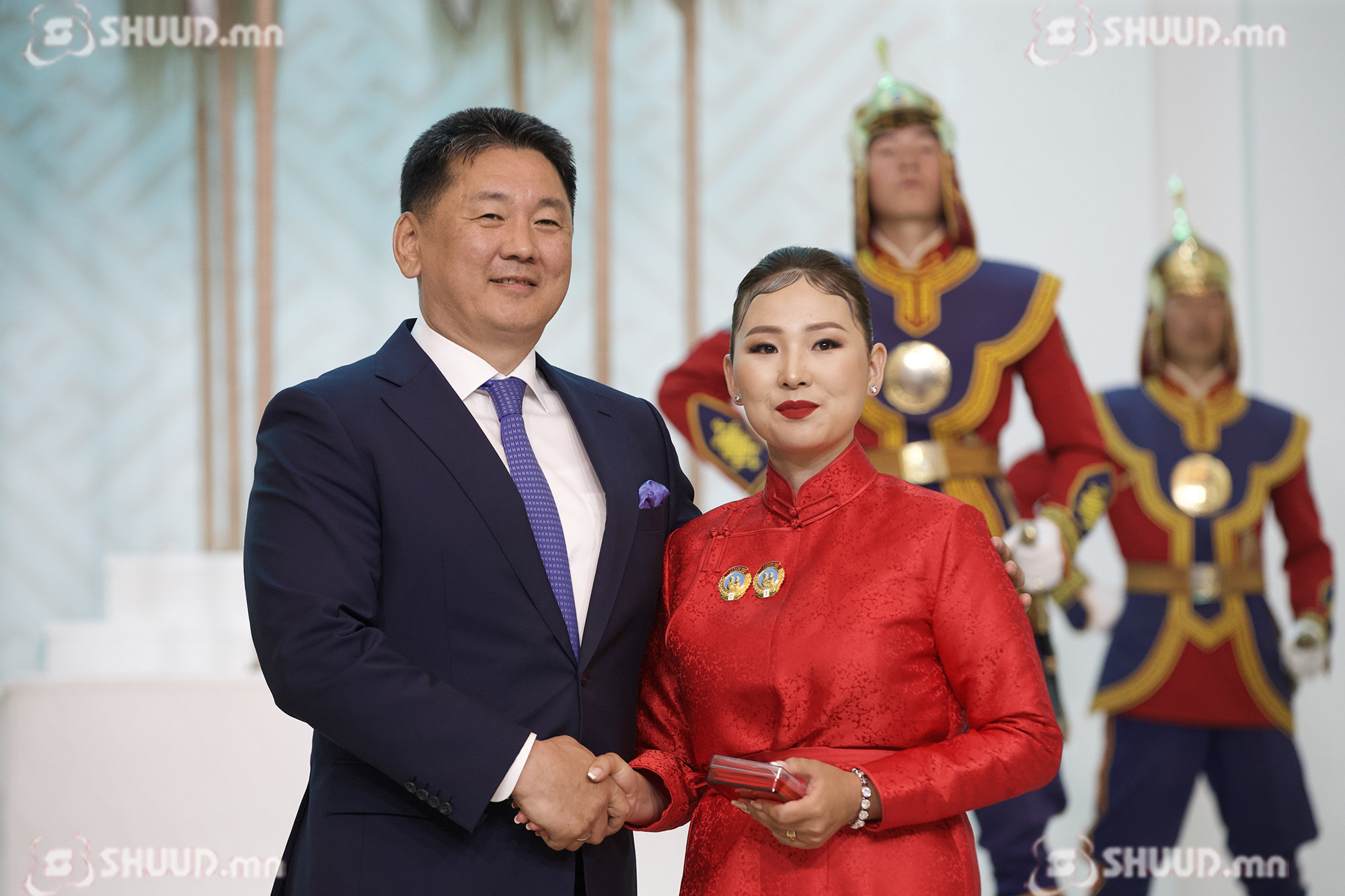 Монгол Улсын Ерөнхийлөгч У.Хүрэлсүх "Эхийн алдар" одон гардуулж байна. “Эхийн алдар” I, II зэргийн одонг Б.Баасанжаргал, Г.Ганцэцэг, Ч.Золжаргал, Т.Золзаяа нарт хүртээлээ.