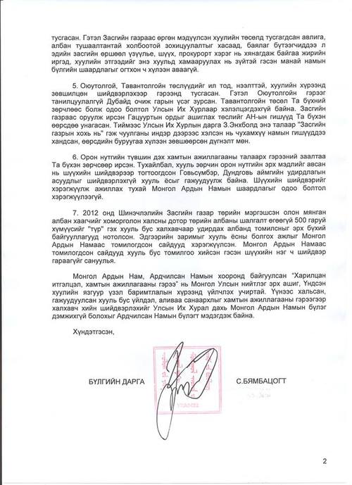 Мөн хариу албан бичигт "Монгол Ардын Нам, Ардчилсан Намын хооронд байгуулсан “Харилцан итгэлцэл, хамтын ажиллагааны гэрээ” нь Монгол Улсын нийтлэг эрх ашиг, Үндсэн хуулийн язгуур үзэл баримтлалын хүрээнд үйлчлэх учиртай. Үүнээс хальсан, гажуудуулсан хууль бус үйлдэл, аливаа санаархлыг хамтын ажиллагааны гэрээгээр халхавч хийн шийдвэрлэхийг УИХ дахь МАН-ын бүлэг дэмжихгүй болохыг АН-ын бүлэгт мэдэгдэж байна" гэжээ.
