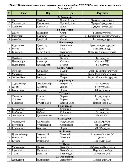 Тус хөтөлбөрт хүсэлтээ ирүүлсэн сурагчдын материалыг сум дүүрэг, аймаг болон улсын түвшинд томилогдсон ХААН Банкны ажилтнууд, төр захиргаа, боловсролын байгууллага болон иргэдийн төлөөллөөс бүрдсэн комисс орон даяар шалгаруулалтыг 3 үе шаттайгаар явуулсны үндсэн дээр 2017-2018 оны хичээлийн жилд ХААН Банкны тэтгэлэг авах 70 шилдэг сурагчийг тодрууллаа.