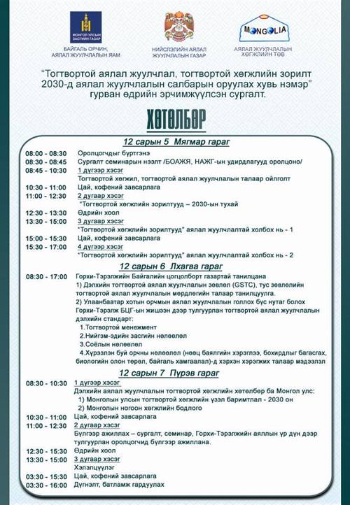 “Тогтвортой аялал жуулчлал, тогтвортой хөгжлийн зорилт 2030-д аялал жуулчлалын салбарын оруулах хувь нэмэр” сэдэвт сургалтыг ирэх сарын 5-7-ны хооронд зохион байгуулах гэж байна. Нийслэлийн Аялал жуулчлалын газар Байгаль орчин, Аялал жуулчлалын яамтай хамтран дэлхийн аялал жуулчлалын чиг хандлага, олон улсын туршлагаас суралцах, тус салбарынхны мэдлэг чадварыг дээшлүүлэх зорилгоор хийж байгаа юм.