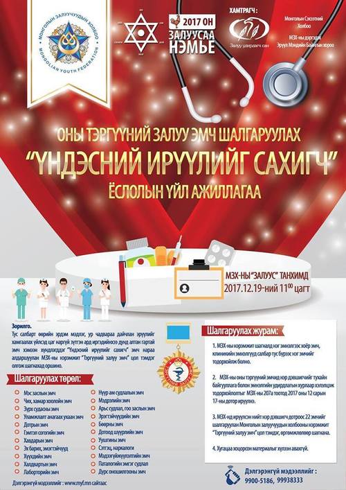 Ёслол энэ сарын 19-нд болох бөгөөд энэ хүрээнд дүрс оношилгоо, уламжлалт эмчилгээ, мэс засал, сэтгэц, хавдар, нүүр ам судлал, сэхээн амьдруулах, яаралтай тусламж зэрэг 22 төрлөөр шилдэг залуу эмч нарыг тодруулж, “Тэргүүний залуу эмч” цол тэмдэг, өргөмжлөл олгох гэнэ.