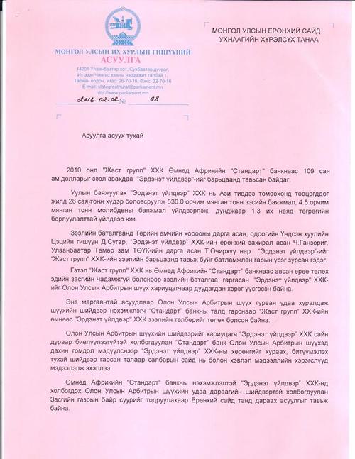 Өмнөд Африкийн "Стандарт“банкны нэхэмжлэлтэй "Эрдэнэт үйлдвэр” ХХК-нд холбогдох Олон Улсын Арбитрын шүүхийн удаа дараагийн шийдвэртэй холбогдуулан Засгийн газрын байр суурийг тодруулахаар Ерөнхий сайд танд дараах асуулгыг тавьж байна.