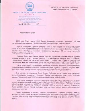 Гэтэл “Жаст групп" ХХК нь Өмнөд Африкийн “Стандарт” банкнаас авсан өрөө төлөх эдийн засгийн чадамжгүй болсноор зээлийн баталгаа гаргасан “Эрдэнэт үйлдвэр" ХХК-ийг Олон Улсын Арбитрын шүүх хариуцагчаар дуудагдан хэрэг үүсгэсэн байна.