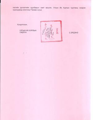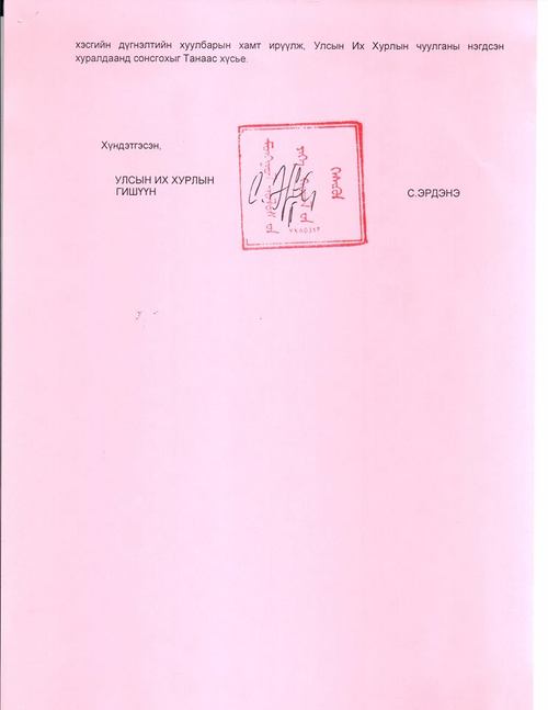 Асуулгын хариуг Монгол Улсын Их Хурлын тухай хуулийн 33 дугаар зүйлийн 33.3 дахь хэсэгт заасан хугацаанд бичгээр ирүүлэхдээ "Жаст групп" ХХК, Өмнөд Африкийн "Стандарт" банк, "Эрдэнэт үйлдвэр" ХХК-иудын байгуулсан гэрээний хуулбар, 2013 онд байгуулагдсан Хууль зүйн яам, Төрийн өмчийн хорооны энэ асуудалтай холбоотой ажлын хэсгийн дүгнэлтийн хуулбарын хамт ирүүлж, Улсын Их Хурлын чуулганы нэгдсэн хуралдаанд сонсгохыг Танаас хүсье" гэжээ.