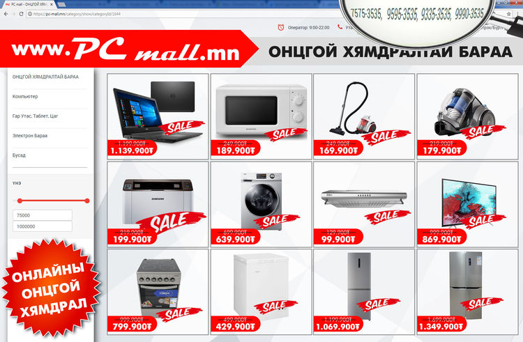 PC Mall дэлгүүр зөвхөн онлайн дэлгүүрээрээ бүх компьютер, гэр ахуйн цахилгаан бараагаа 3 хувь хямдруулан үнэгүй хүрэн өгч байна. Бид сард 2 удаа ОНЦГОЙ хямдралтай бараа зарладаг бөгөөд эдгээр бараа нь дэлгүүр дээр зарагдаж байгаа үнээс хямдаар худалдаалагдаж байна. Жишээлбэл яг одоо Dell Inspiron 3567 core i3 notebook ердөө 1,139,900₮, Elko 50 болон 60тай хиншүү сорогч ердөө 99,900₮, Daewoo KOR-6617W печь 189,900₮, Tornado 43A1 тоос сорогч 169,900 ₮, Samsung 43K5002 Зурагт ердөө 869,900₮ гэх мэт бараанууд хямдралтайгаар худалдаалагдаж байна.