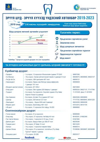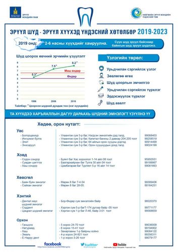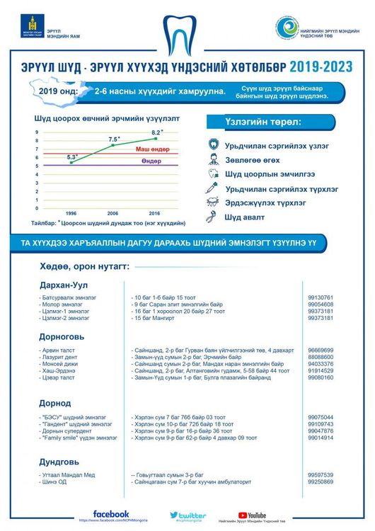 Засгийн газрын баталсан Эрүүл шүд-эрүүл хүүхэд үндэсний хөтөлбөр өнгөрсөн дөрөвдүгээр сараас хэрэгжиж эхэлсэн. Тавдугаар сарын 24-ны байдлаар тус хөтөлбөрт нийт 31 618 хүүхэд хамрагдаад байна. 2-4 насны хүүхдүүдийн шүдэнд нэг удаа 60 мянган төгрөгийн эмчилгээ хийх тус ажил цахим системд шилжихээр бэлтгэл ажил хийгдэж байна.