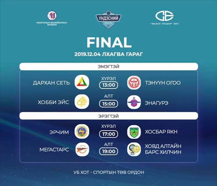 Аваргын төлөө эрэгтэй багуудаас “Хасу Мегастарс”-“Ховд Алтайн Барс-Хилчин”, эмэгтэй багуудаас “Хобби Эйс”-“Энагурэ” шалгаран үлдээд байгаа бол хүрлийн төлөө эмэгтэйд “Дархан Сеть”-“Тэнүүн Огоо”, эрэгтэйд “Эрчим”-“Хосбар RKH” өрсөлдөх юм.