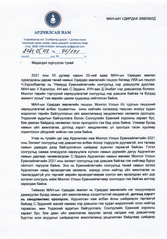Ардчилсан намын Улс төрийн зөвлөлөөс МАН-ын Удирдах зөвлөлд мэдэгдэл хүргүүллээ. Уг мэдэгдэлд "Танай намын Удирдах зөвлөлийн гишүү, УИХ-ын гишүүн Ч.Хүрэлбаатар "Намууд Ерөнхийлөгчийн сонгуульд нэр дэвшүүлж дууслаа. МАН-аас У.Хүрэлсүх, АН-аас С.Эрдэнэ ХҮН-ээс Д.Энхбат нэр дэвшихээр болжээ. Монгол төрийн тэргүүний хариуцлагатай сонгуульд нэр дэвшиж буй та бүгдэд амжилт хүсье." гэжээ. Хариуцлагатай албан тушаалтны олон нийтийн сүлжээнд тавьсан энэ мэдээлэл төрийн байгууллагын үйл ажиллагаанд хөндлөнгөөс нөлөөлж, оролцож, ҮАГ, сонгуулийн төв байгууллагын хараат бус, бие даасан байдалд нөлөөлөх гэсэн оролдлого гэж бид үзэж байна. Улмаар намын үйл ажиллагаанд хөндлөнгөөс үл оролцох гэсэн хуулиар хориглосон үйлдлийг зөрчлөө. Тиймээс хууль зөрчсөн үйлдлээ зогсоохыг шаардаж байна" гэдгээ мэдэгджээ.