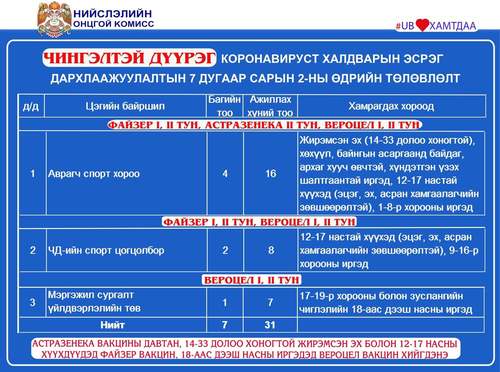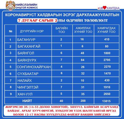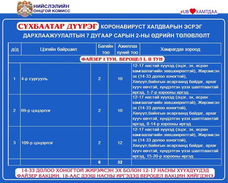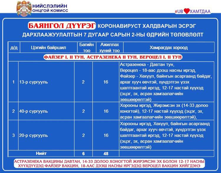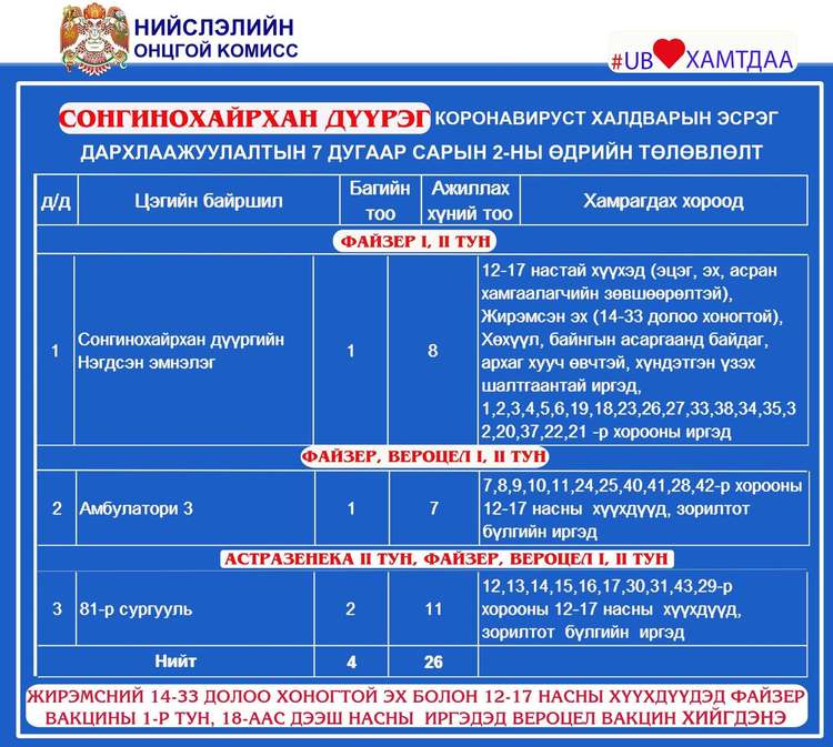 Өнөөдөр Улаанбаатар хотод 25 суурин цэгт 40 багийн 288 эмч, ажилтан ажиллаж, 13815 иргэнийг дархлаажуулна. Дархлаажуулалтын цэгүүдийг дүүрэг тус бүрээр танилцуулж байна.