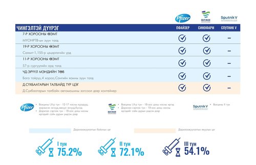 Өнөөдөр Улаанбаатар хотод суурин 38 цэг, түр 2 цэгт 40 багийн 138 эмч, ажилтан ажиллана. Та өөрт ойр вакцины аль ч цэгт очиж дархлаажуулалтад хамрагдах боломжтой. Дархлаажуулалтын цэгүүд 09:00-16:00 цаг хүртэл ажиллана.