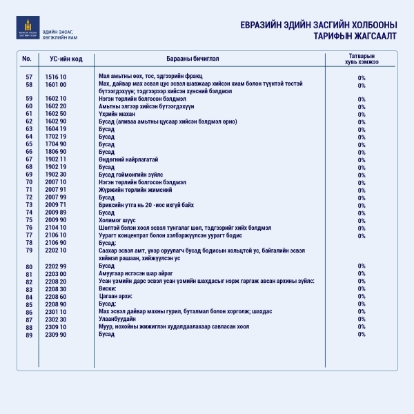 Еврази: Тарифыг бүрэн тэглэх бараа бүтээгдэхүүний жагсаалт