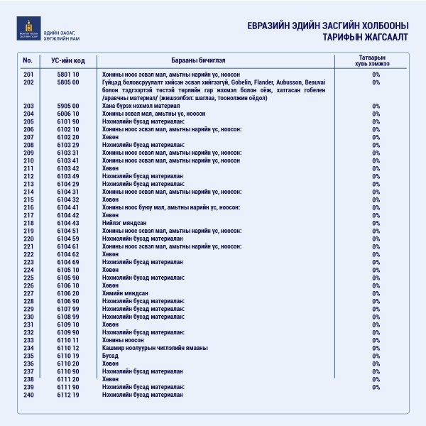 Харин хэлэлцээрийн хүрээнд доорх жагсаалтад дурдсан бараа, бүтээгдэхүүнүүд татваргүйгээр Евразийн эдийн засгийн холбооны /Орос, Казахстан, Беларусь, Армени, Киргиз/ орнуудаас импортоор орж ирэх юм.
