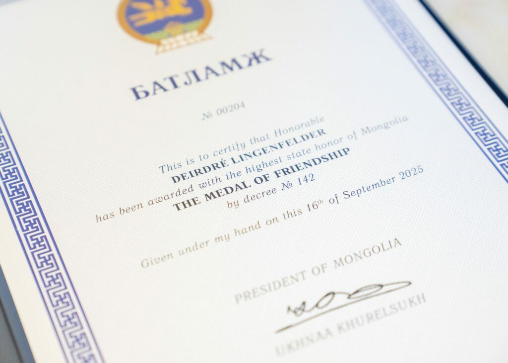 “Оюу толгой” компанийн Гүйцэтгэх захирал Дейрдрэ Лингенфелдерийн Монгол Улсын уул уурхайн салбарт оруулсан хувь нэмрийг үнэлэн “Найрамдал медаль”-аар шагналаа
