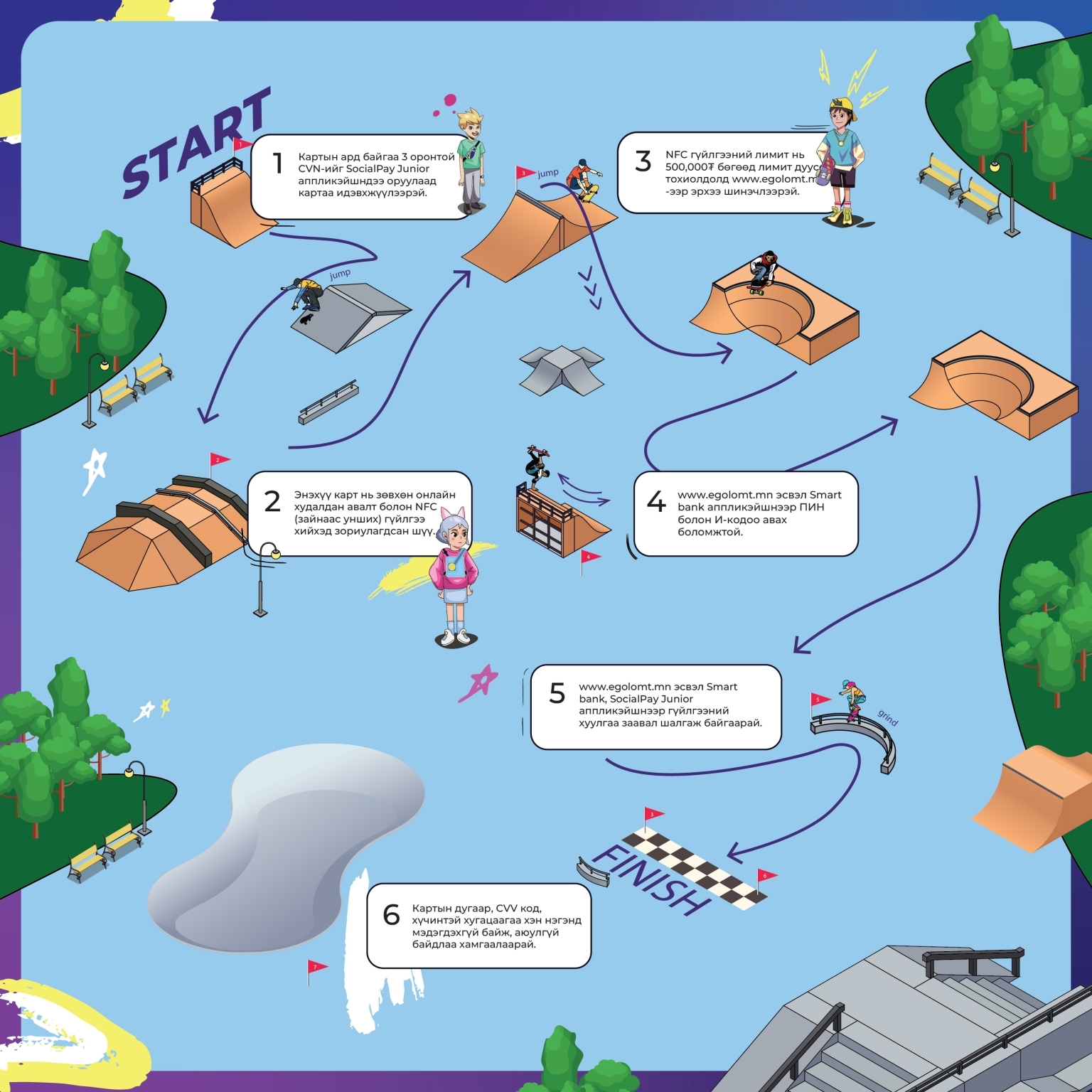 7-22 насны хүүхэд, залуус Skate card-ийн хэрэглэгч болсноор бага наснаасаа мөнгөтэй харьцаж, төлбөр тооцоогоо удирдаж, санхүүгийн зөв хэрэглээнд суралцахаас гадна шинэлэг, өвөрмөц, дизайн бүхий fingerboard-ийг өөрийн хэв маяг, загварын нэг хэсэг болгон ашиглах боломжтойгоороо онцлогтой.