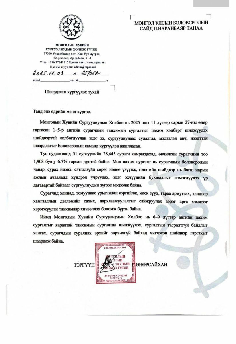Иймд Монголын Хувийн Сургуулиудын Холбоо нь 6-9 дүгээр ангийн цахим сургалтыг яаралтай танхимын сургалтад шилжүүлэх, сургалтын тасралтгүй байдлыг хангах, сурагчдын суралцах эрхийг зөрчихгүй байхад чиглэсэн шийдвэр гаргахыг шаардаж байна" гэжээ.
