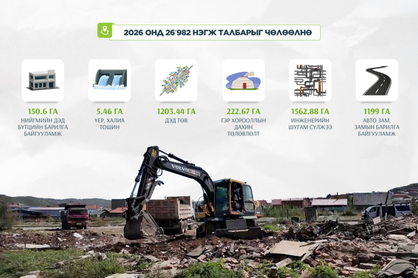 Газар чөлөөлөх бэлтгэл хангах үүргийн дагуу нийслэлийн газар зохион байгуулалтын 2026 оны төлөвлөгөөнд тусгасан 341 төсөлд зориулж 26982 нэгж талбарын 4344,05 га газрыг нөхөн олговортой чөлөөлөхөөр бэлтгэж байна.