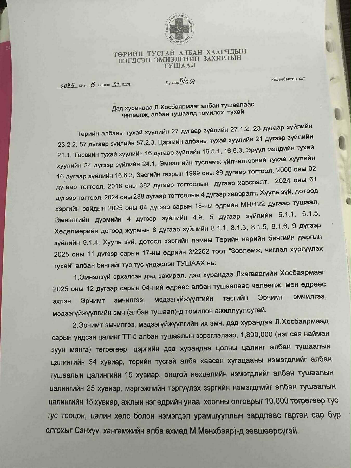 Эдгээр албан хаагчид хаачих вэ? Тэд ямар гэмтэй вэ? Эдгээр алба хаагчид шүүхэд хандаж эргэн томилогдсон тохиолдолд ажилгүй байсан хугацааны цалинг та төлөх хуультайг сануулъяа! Үүгээр зогсохгүй хамгийн ноцтой нь эмнэлэгийн бүтэц нууц гэдгээр далимдуулан өөрийн багаа бүрдүүлэх зорилгоор удирдах албан тушаалд Нийтийн албанд нийтийн болон хувийн ашиг сонирхлыг зохицуулах, ашиг сонирхлын зөрчлөөс урьдчилан сэргийлэх тухай хуулийн 23 дугаар зүйлийн 23.5, 23.7, 23.9-д заасныг тус тус зөрчин Эмнэлзүй эрхэлсэн дэд захирал А.Туяа, Хүний нөөцийн дарга Д. Эрдэнэдэлгэр, Өдрийн эмчилгээний тасгийн эрхлэгч Очирчимэг нарыг томилон АТГ-аас хариу ирээгүй байхад тамга тэмдэг, эрх мэдлийг олгон ажиллуулж байгаа нь хууль зөрчсөн нилээн том асуудал болоод байна. Төрийн хууль тэдэнд үйлчилдэггүй бололтой…