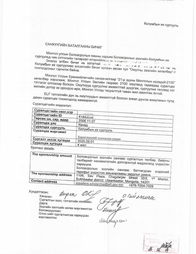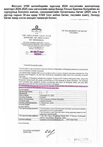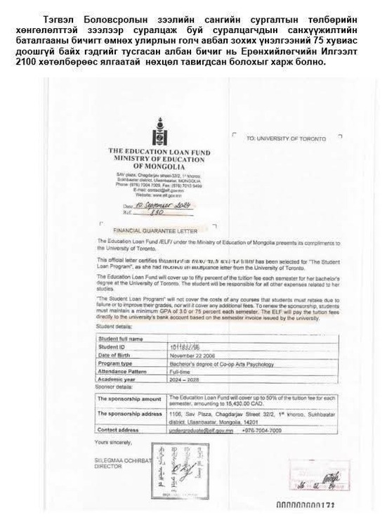 Энэхүү санхүүжилтийн баталгааны бичиг нь тухайн суралцагчдыг албан бичигт дурдагдсан их сургуульд суралцах хугацаанд холбогдох зардлыг даахыг баталгаажуулах зорилготой юм. (Илгээлт 2100 хөтөлбөр, Боловсролын зээлийн сангийн зээлээр суралцах бичгийг хавсаргав.)