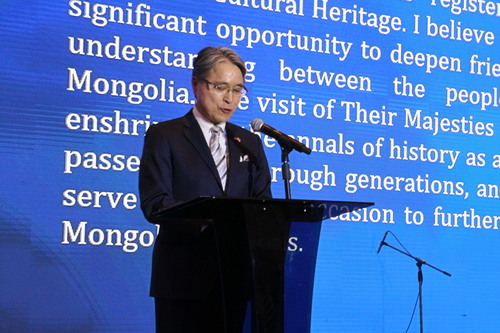 Дуучин Д.Оюунтүлхүүр болон Ю.Окүяма нар хоёр орны төрийн дууллыг дуулсаны дараа Элчин сайд М.Игавахара мэндчилгээ дэвшүүлэв. Тэрбээр хэлсэн үгэндээ өнгөрсөн оны 7 дугаар сард Япон Улсын Цог Жавхлант Эзэн хаан болон Эрхэм дээд Хатны Монгол Улсад хийсэн төрийн айлчлал нь хоёр орны харилцааг улам бүр бэхжүүлэхэд өндөр ач холбогдолтой завшаан болсон хэмээгээд ирэх 2027 онд тохиох Япон Улс, Монгол Улсын хооронд дипломат харилцаа тогтоосны 55 жилийн ойг угтан хоёр орны найрамдалт харилцааг цаашид улам бүр гүнзгийрүүлэн хөгжүүлэх хүсэлтэй байна хэмээв.