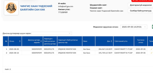 "Эрдэнэс Монгол" ХХК нь "ЧИНГИС ХААН ҮНДЭСНИЙ БАЯЛГИЙН САН" ХХК-д оффисийн зардалд 250-190 сая төгргийг шилжүүлжээ